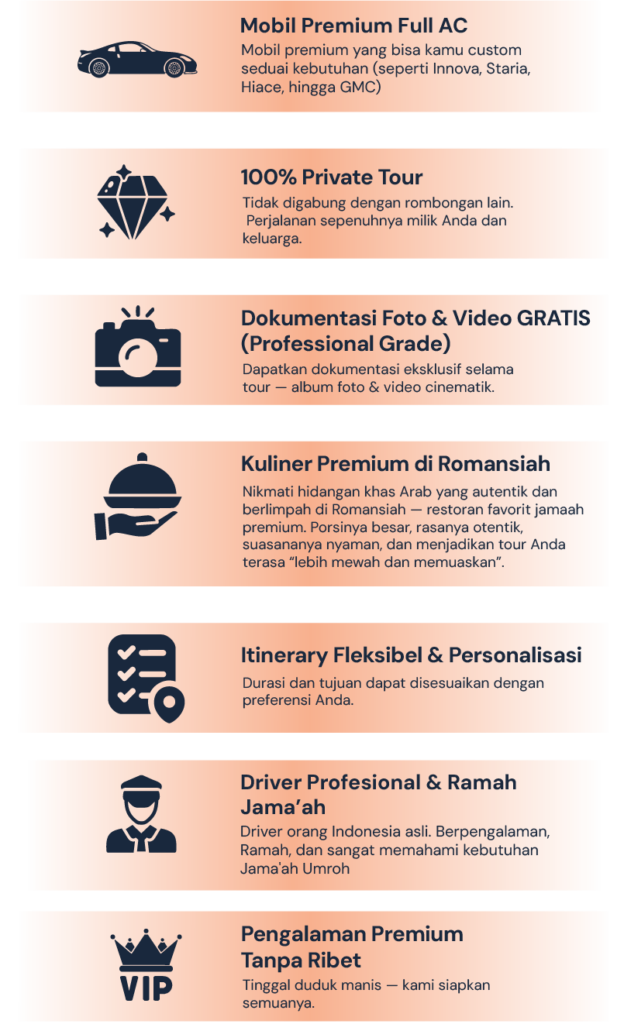 Kami adalah penyedia Premium Private City Tour untuk jamaah Umroh Mandiri di Arab Saudi.